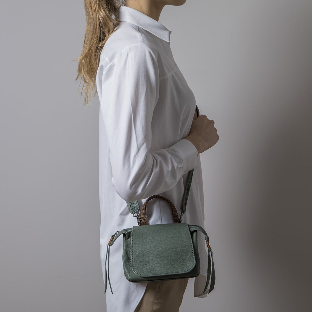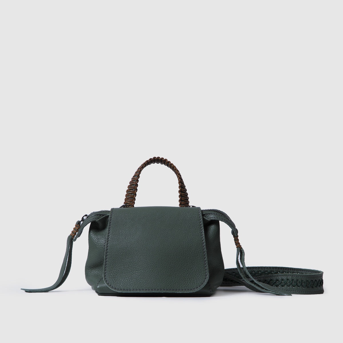 Meet the mini cross body. This unique distinctive silhouette features the signature woven top handle, and a wide detachable leather cross stitched strap. This little bag is remarkably spacious.