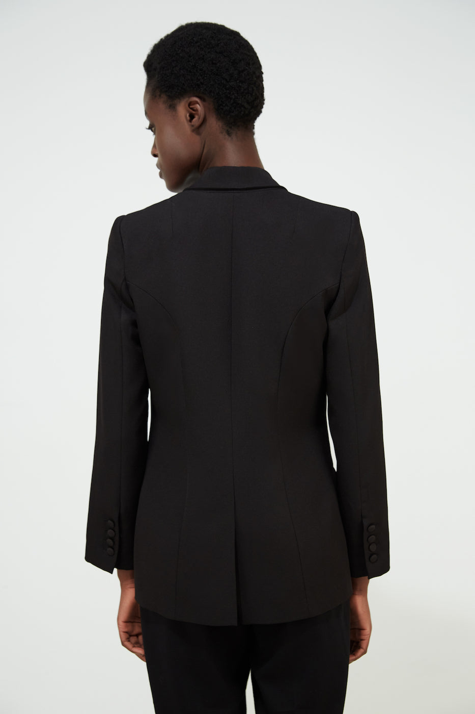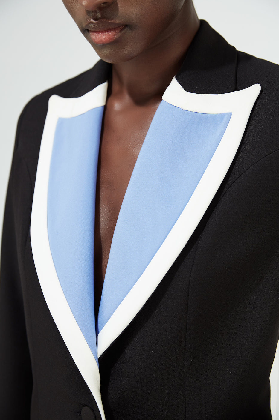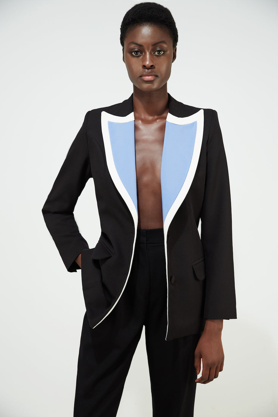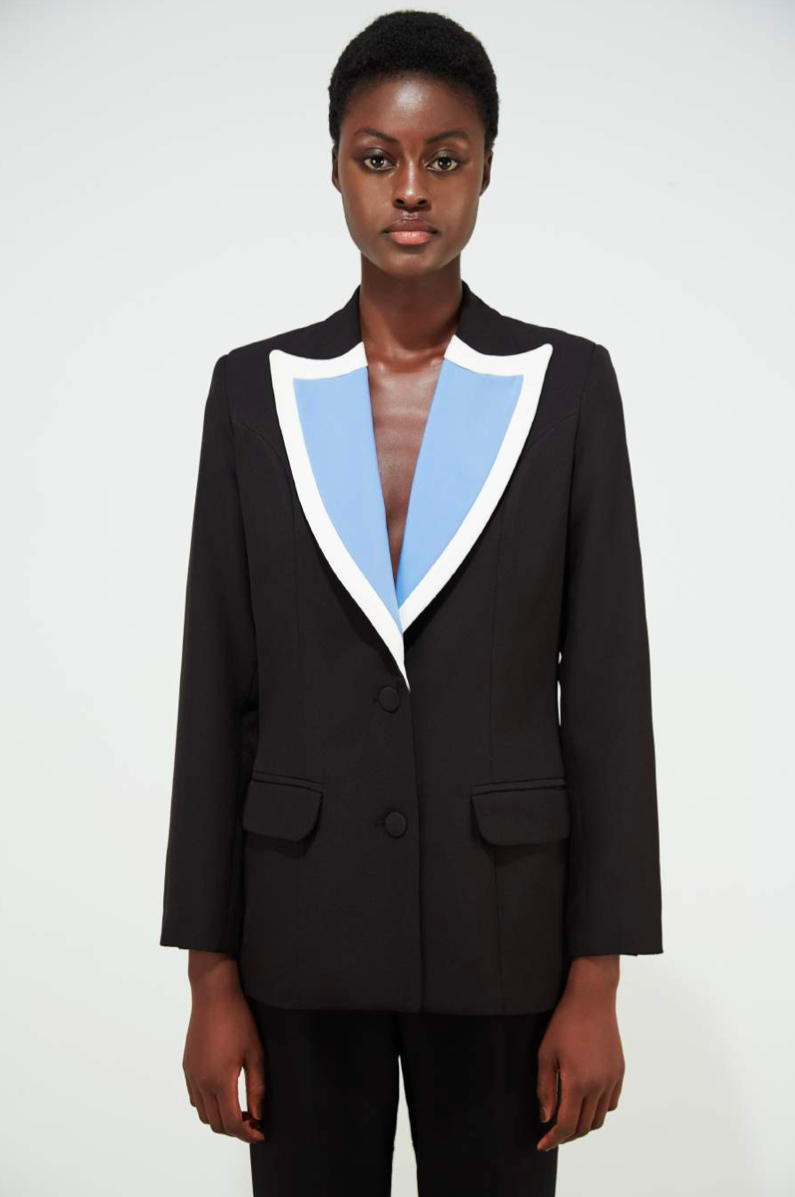 A striking style to throw a little more edge into your wardrobe. This single-breasted jacket is masterfully designed for a striking silhouette. Contrasting colour lapels inspired by the Blue Morpho butterfly - which has bright blue wings edged with black, and a touch of white details.