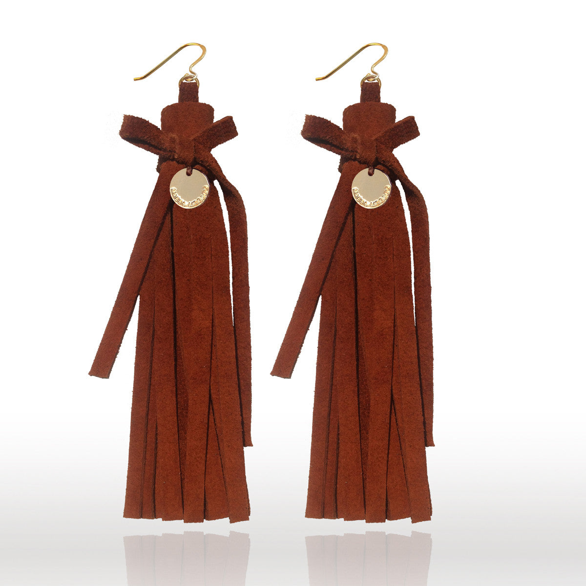 Handmade luxurious fine suede statement earrings featuring a delicate bow and thick tassle, with a decorative gold-plated coin featuring 'Maesa Morado' logo.