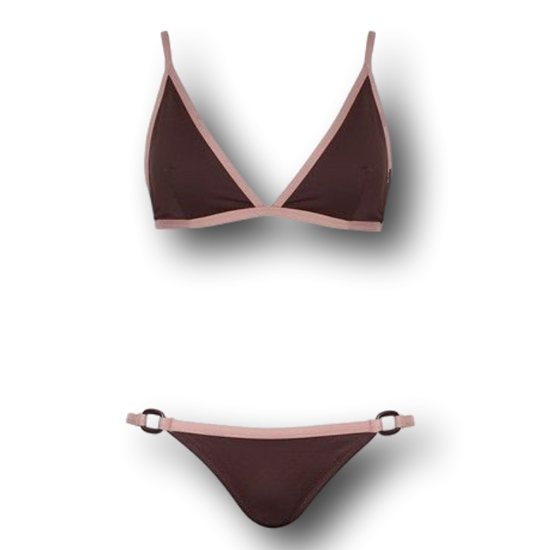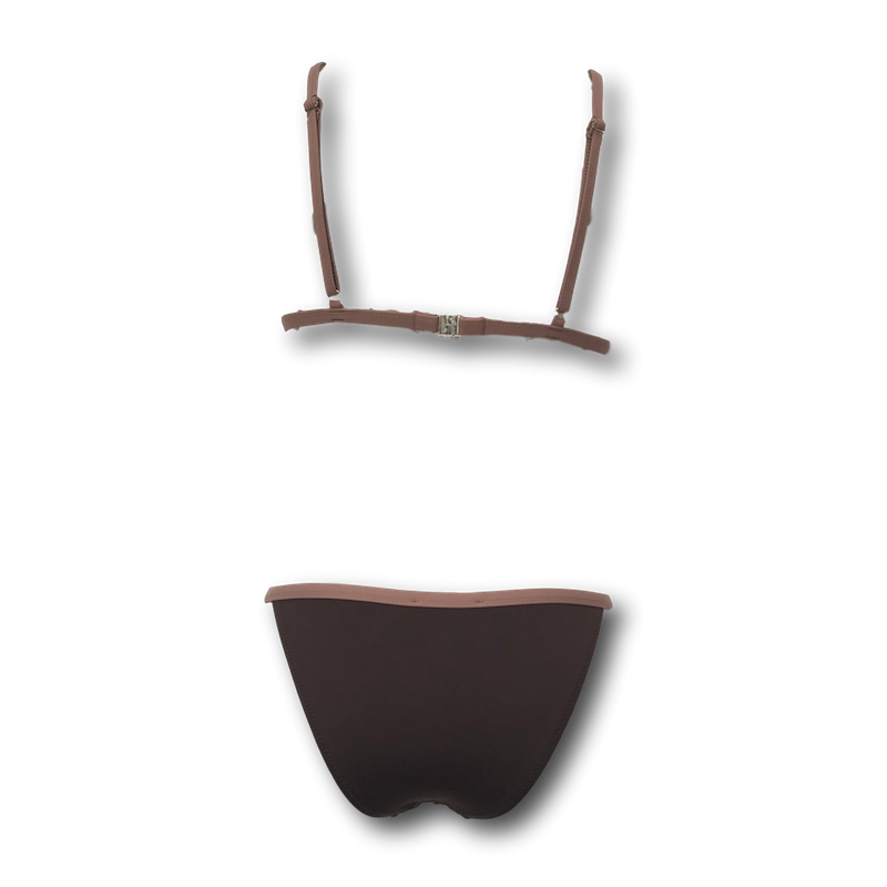 Triangle bikini top with contrast trim and adjustable straps to find the most comfortable fit. Back fastening. Medium coverage, petite brief with thin straps and 2 colour bronze oval ring embellishments.