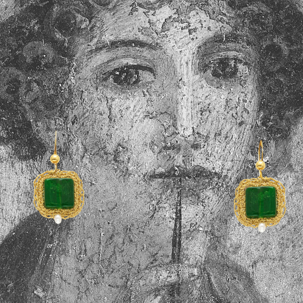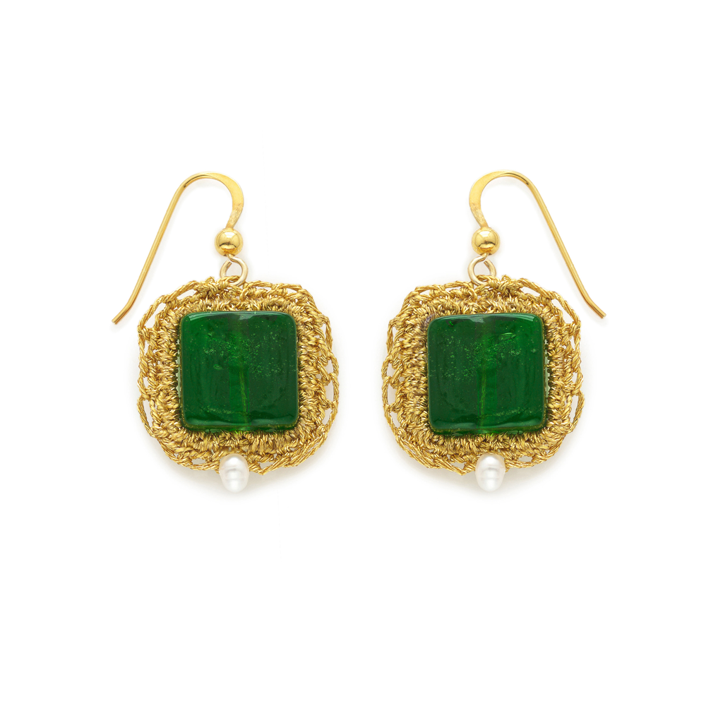 Handcrafted earrings featuring thick authentic Murano glass stones, encased in a traditional crochet lace pattern. Accented with delicate freshwater pearls.