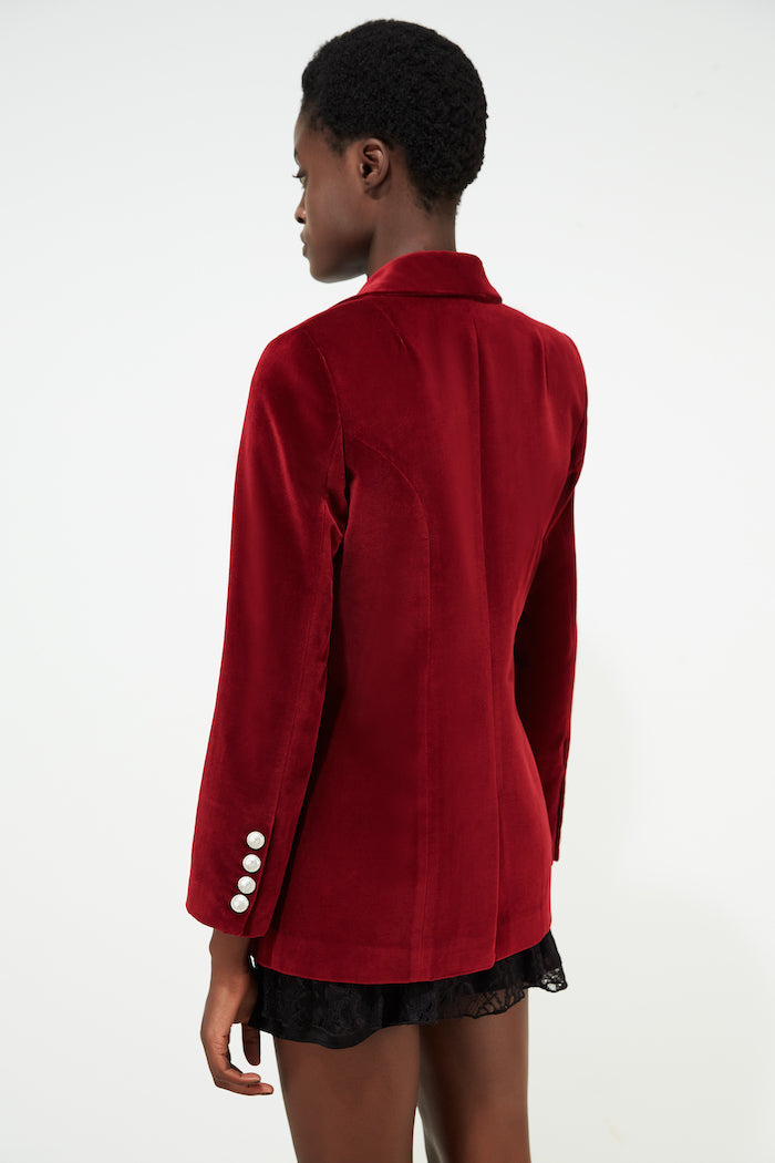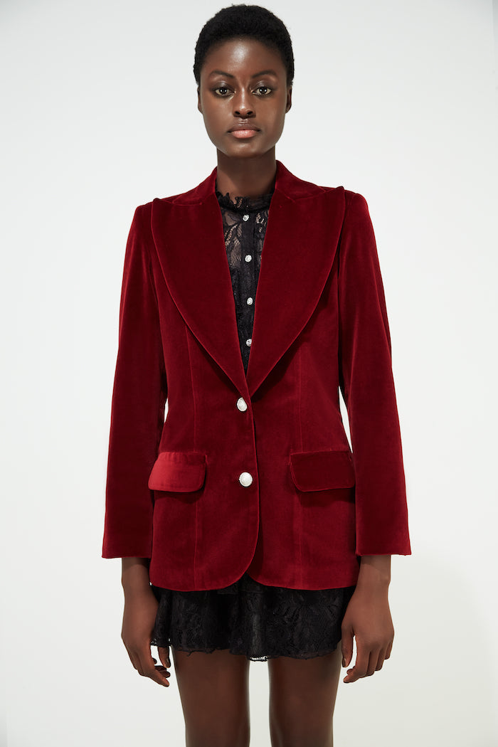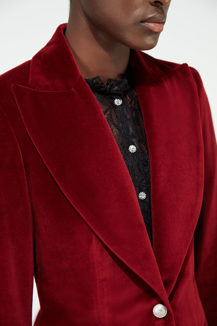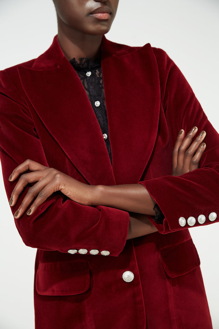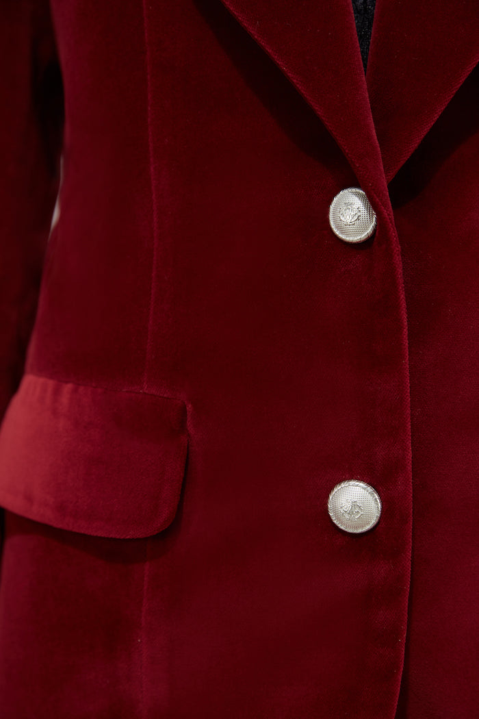 Sophisticated nobility. This luxurious single-breasted burgundy jacket is masterfully made from premium irresistible premium velvet.
