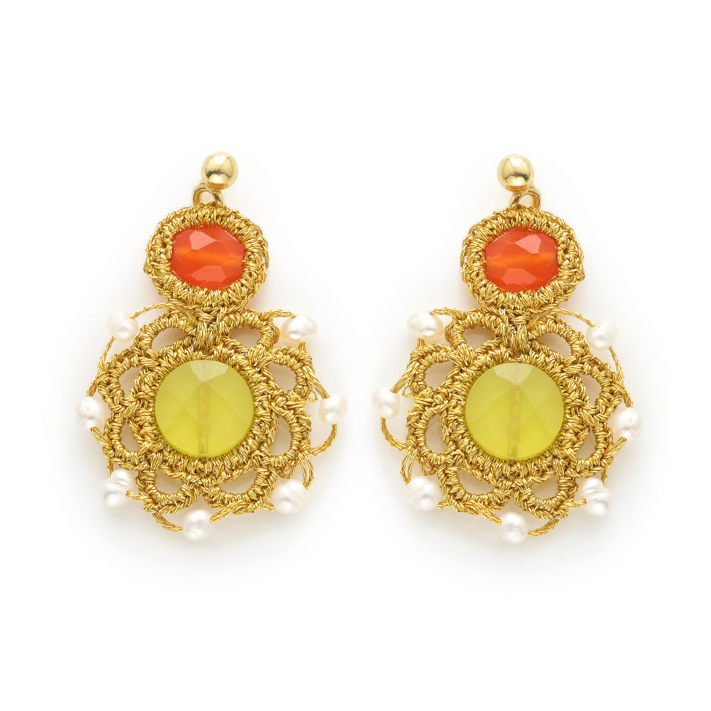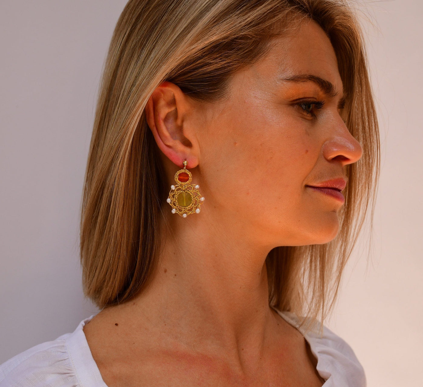 Delicate handcrafted crochet earrings featuring a detailed scalloped crochet design encasing coloured curved stones.