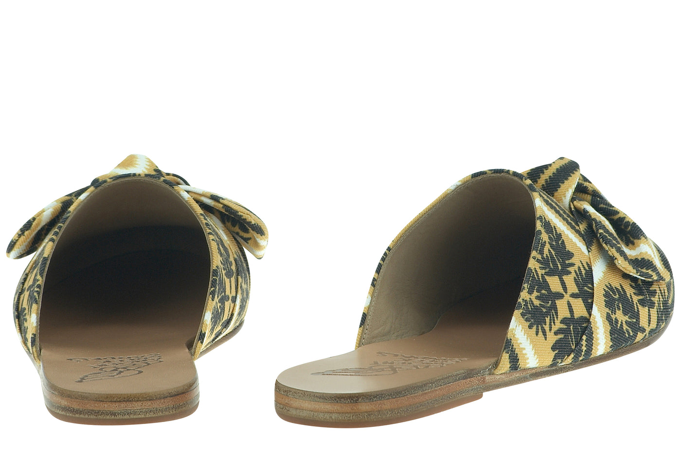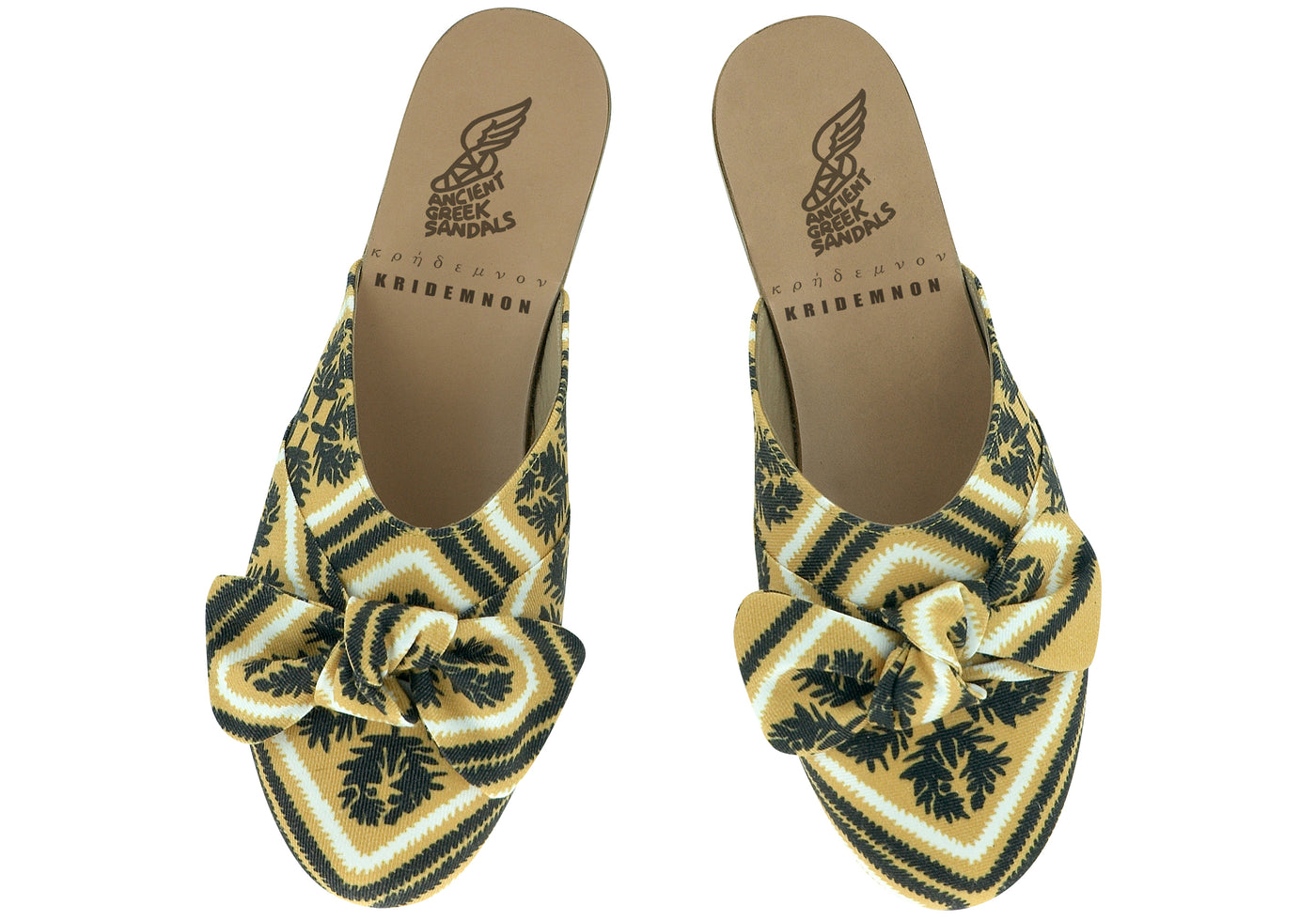 Make a stylish statement with these premium handcrafted leather lined mule shoes. The featured print is a collaboration between Ancient Greek Sandals and Greek scarf maker Kridemnon. Perfect with your white tee and cropped denims.