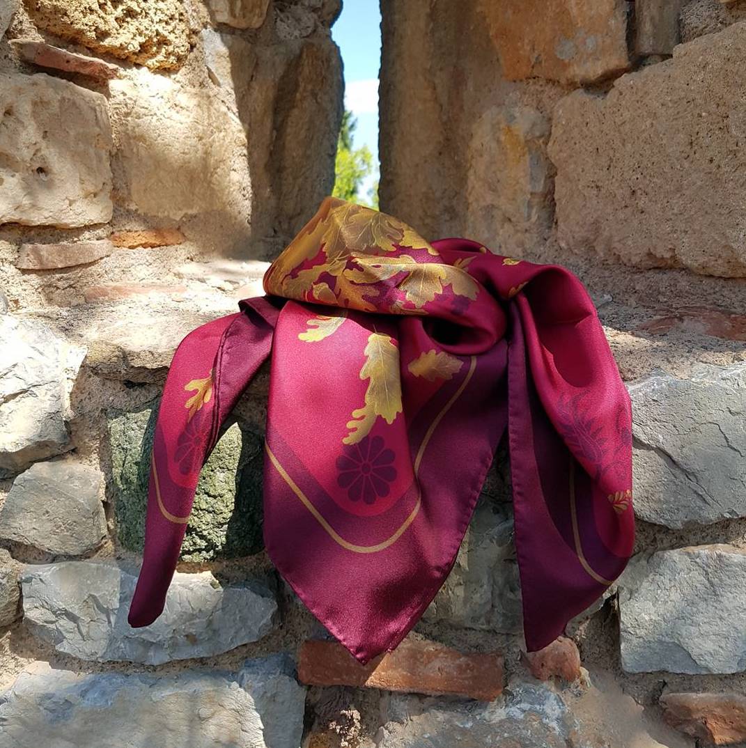 A luxurious 100% silk twill scarf with hand-rolled hemming and featuring a hand illustration of the Wreath worn by Philip II of Macedon, Alexander the Great's father. Details include the fine 313 gold oak leaves and 68 acorns. Wear your scarf many different ways: around your neck, as a belt, as a top, as a headscarf, or frame it on your wall.