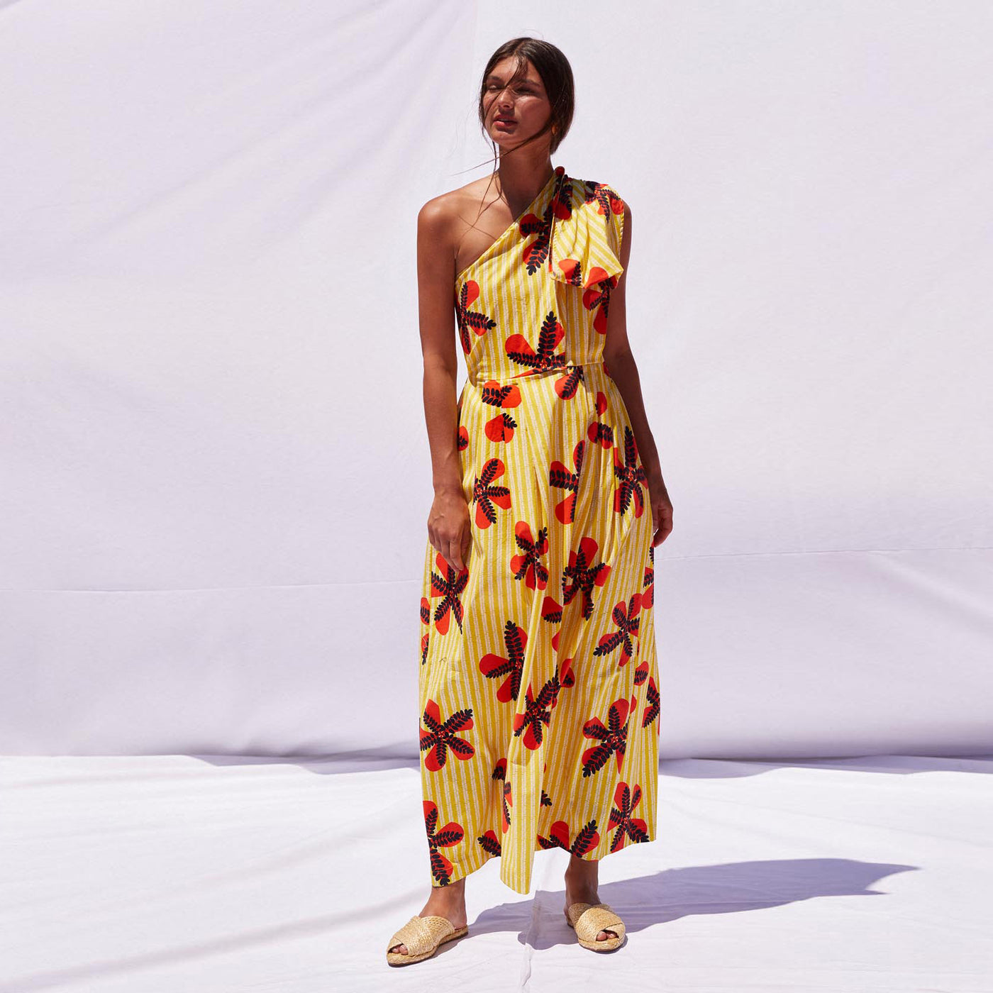 A one shoulder colourful summer pleated maxi dress featuring accent which can be placed front or back.