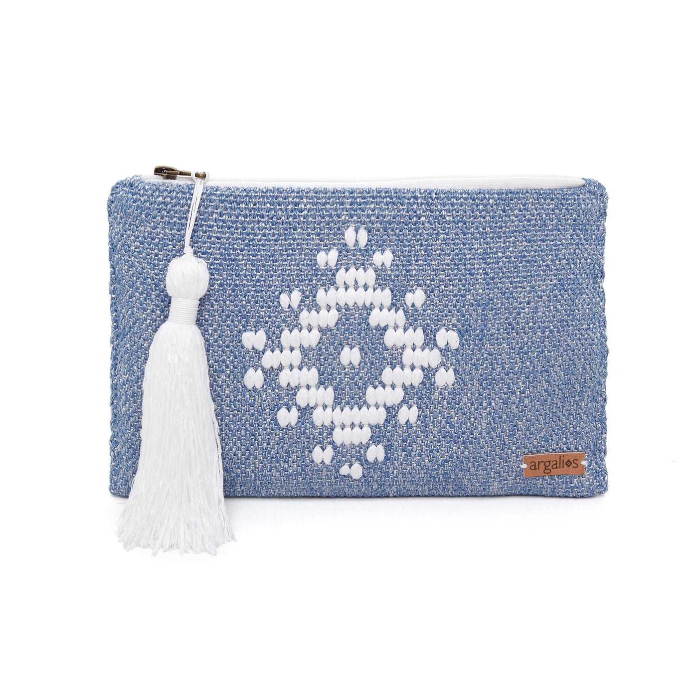 This hand-woven clutch fits all your essentials, and more! It features a blende denim blue sheen-like finish and a diamond white floral motif and adorned with a luxuriously thick, white tassle.