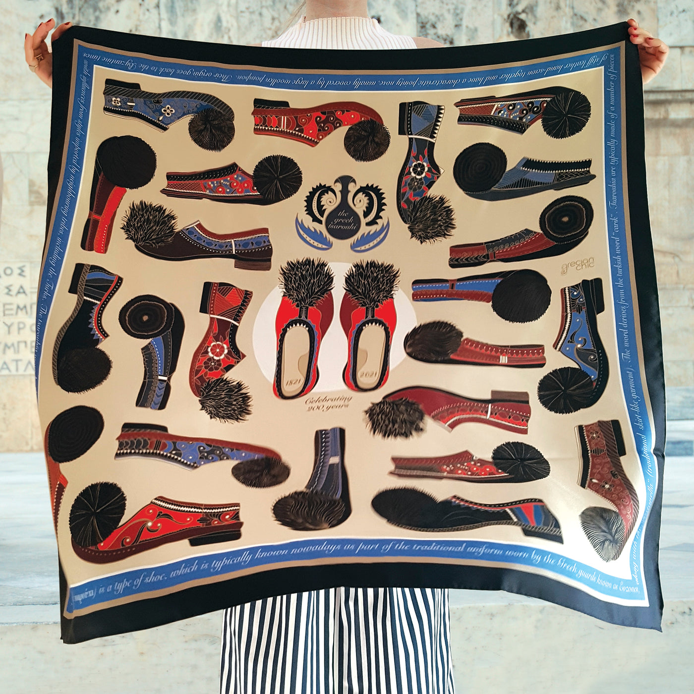 Grecian Chic Scarves are handmade fine silk scarves featuring, hand-illustrated comical motifs and cultural references.