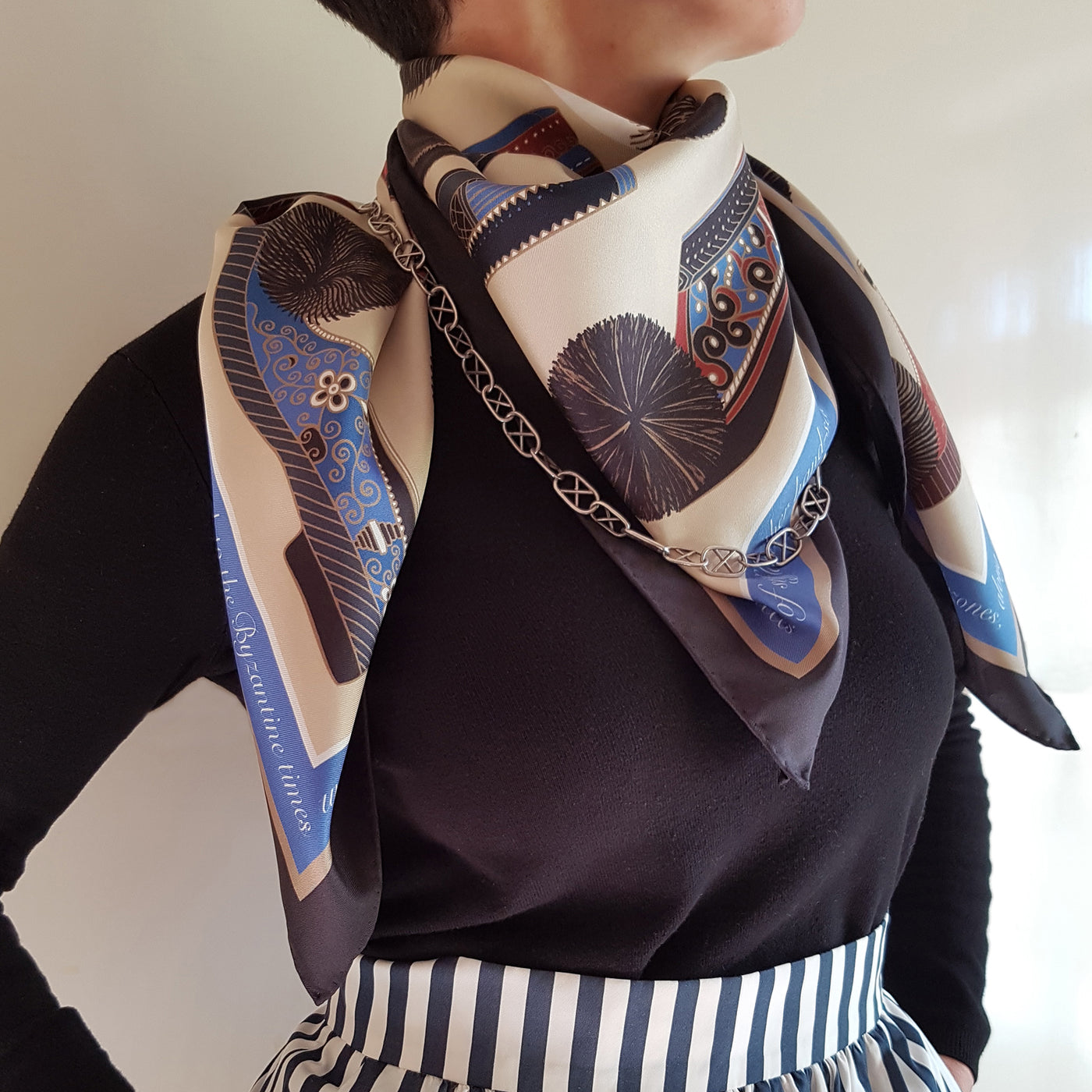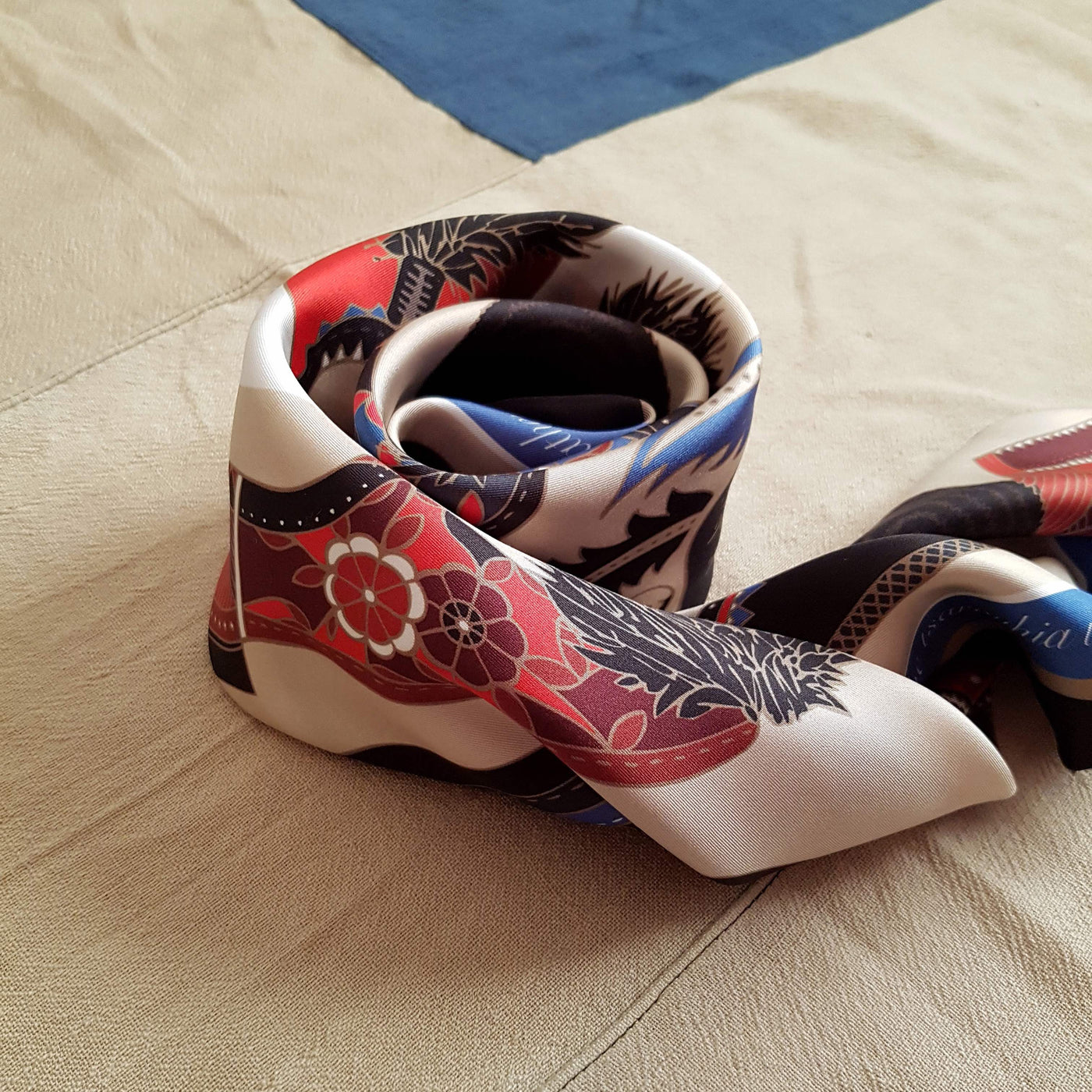 A luxurious silk is scarf made with silk twill and finished with hand-rolled hemming. The ideal accessory to complement your style. Wear it many different ways: around your neck, as a top, as a headscarf, or frame it on your wall!,