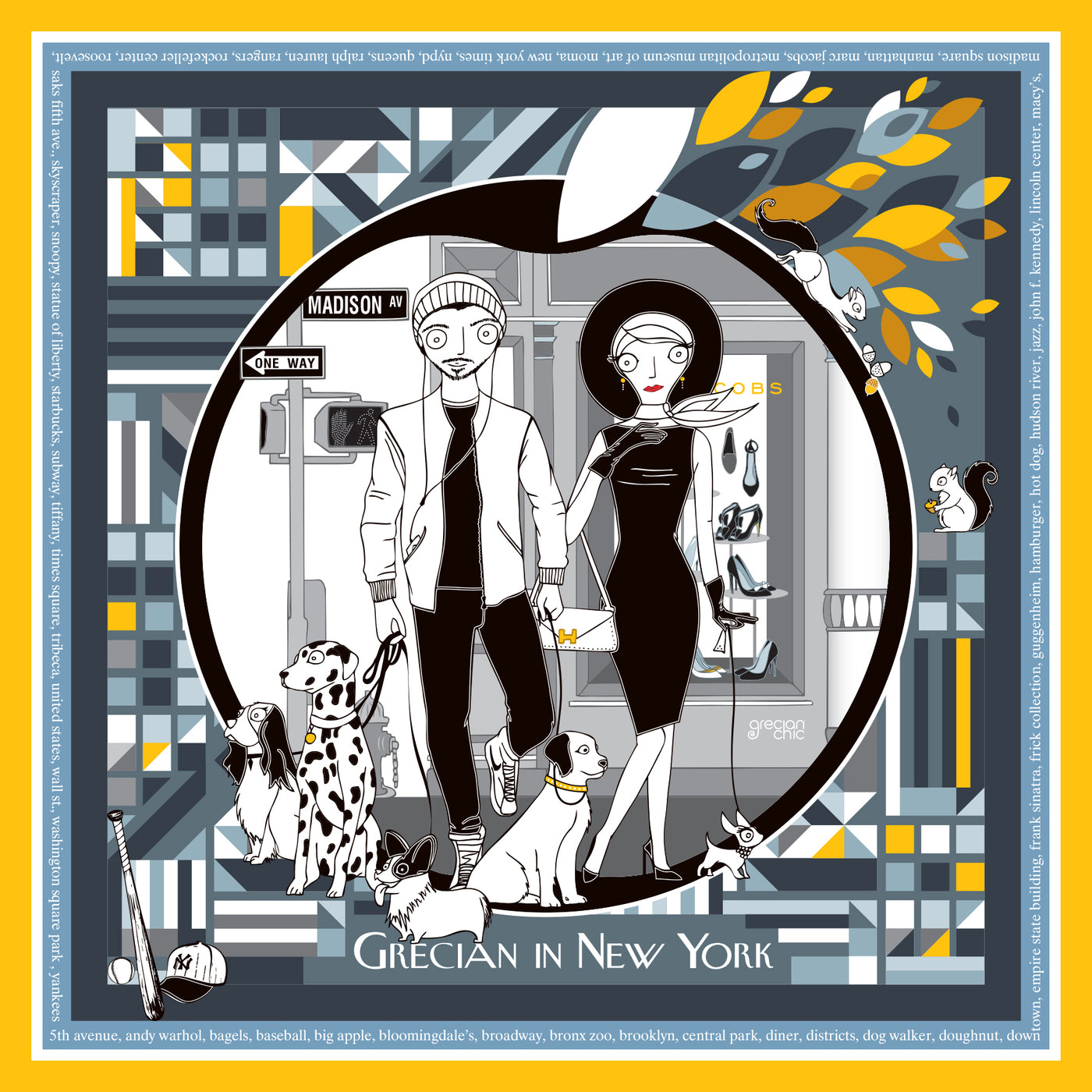 Grecian Chic Scarves are handmade fine silk scarves featuring, hand-illustrated comical motifs and cultural references.
