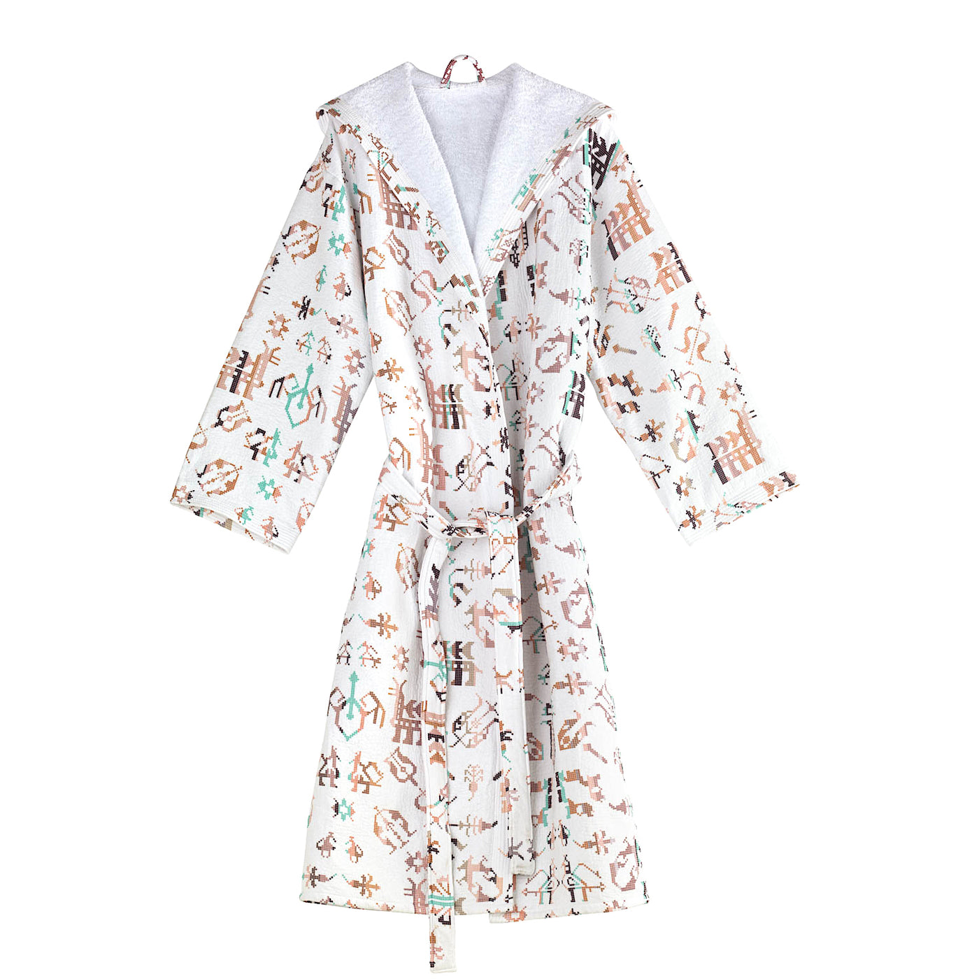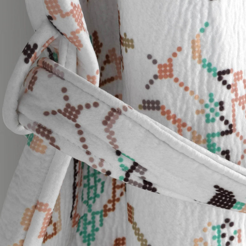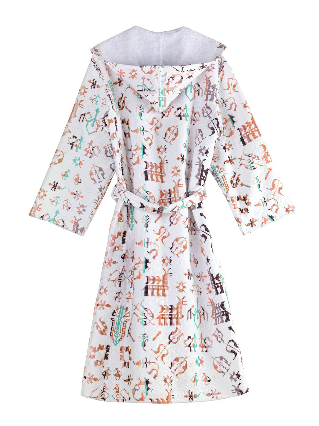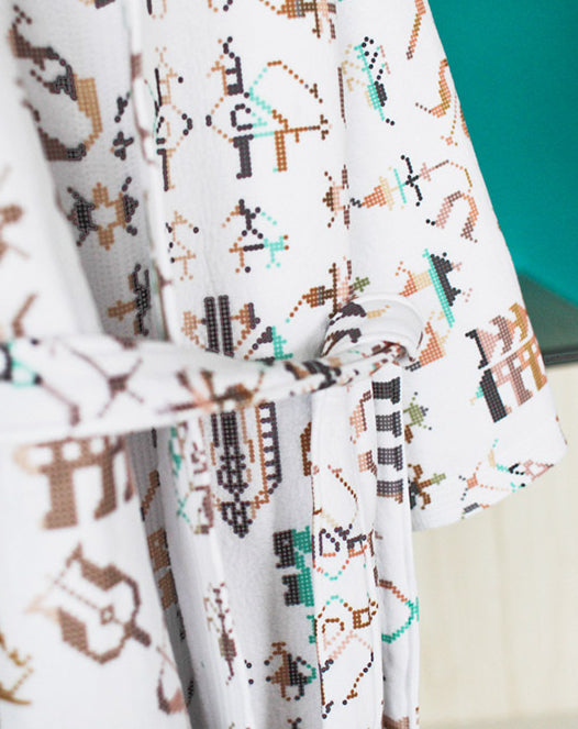 Wrap yourself in this digitally printed, luxurious and generously sized bathrobe. An ultra soft-to-touch plush texture, with a fluffy absorbent towel on the reverse. The digital print features a post-modern expression of the embroidered fertility motifs commonly seen on 18th-century tapestries from the Ionian islands.