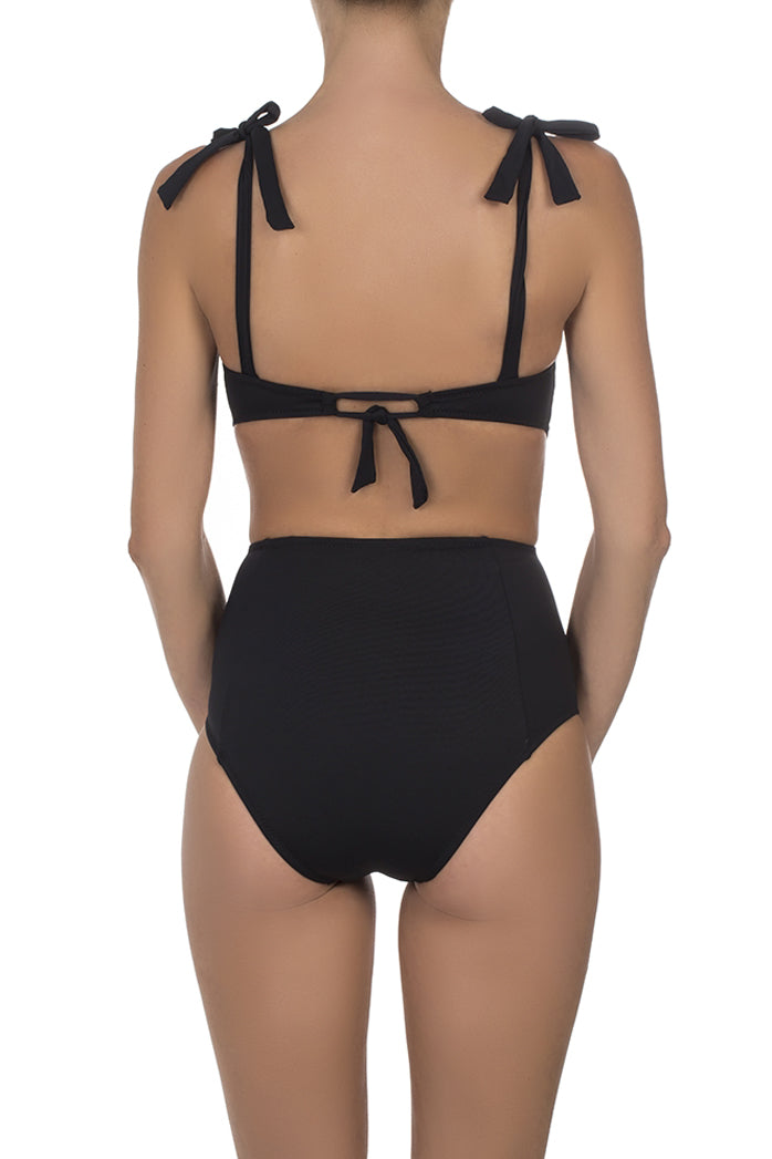Retro style one-piece scoop neck-line. High waisted cut out front. Self-adjusting thick ties on the shoulders and across back. Medium coverage. Back appears like a Bikini. Ruffle detail at front.