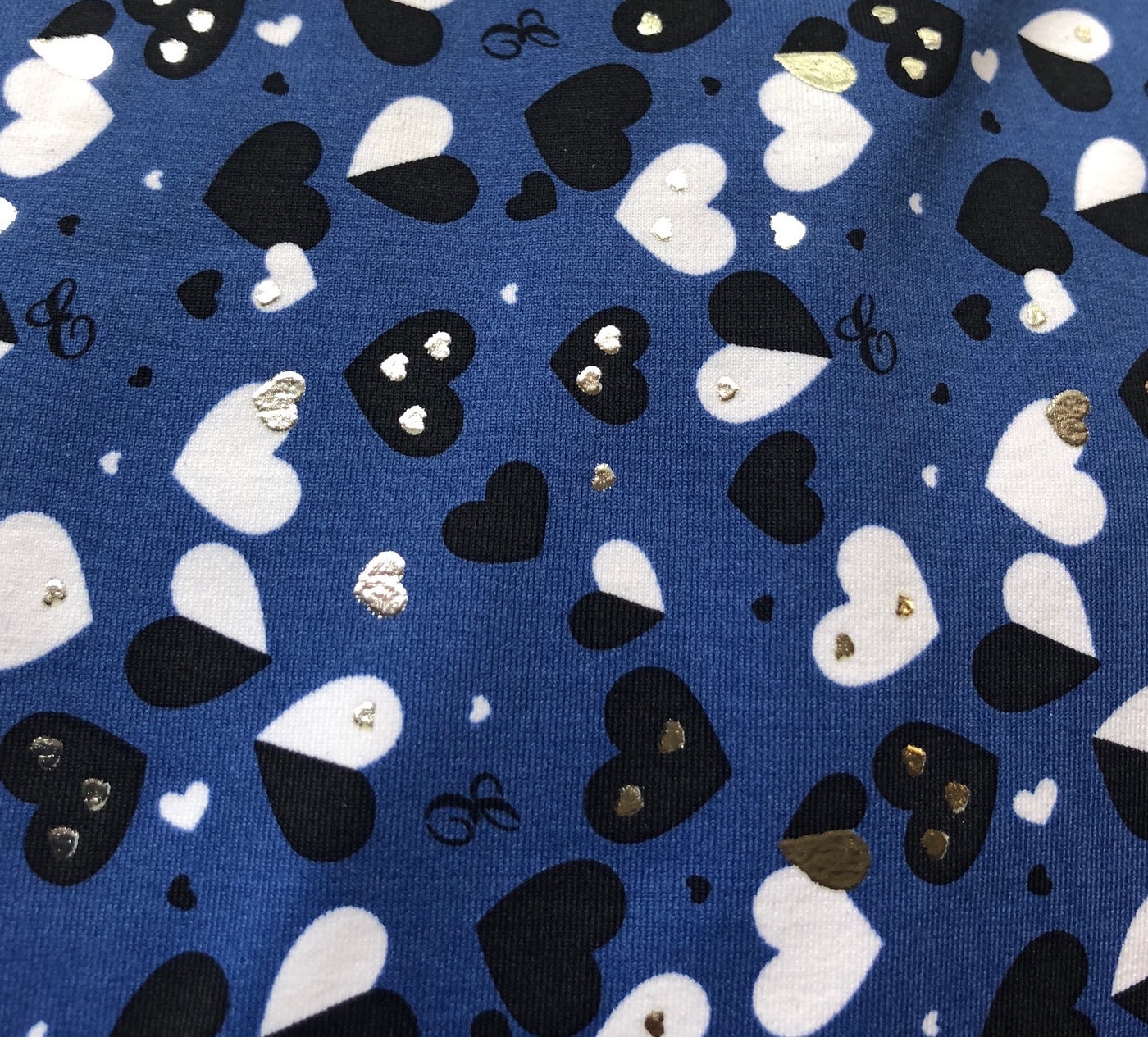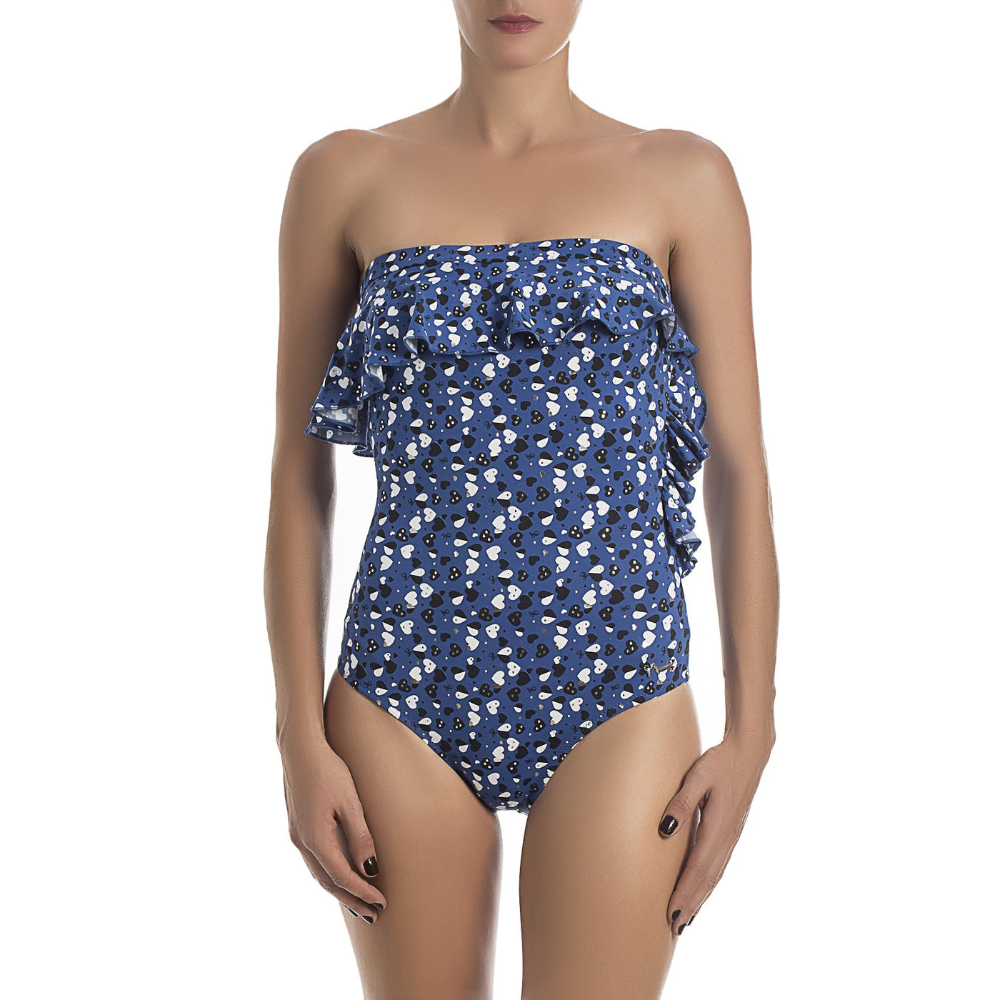 Bandeau one-piece featuring a print of many hearts. Ruffled along the back and front and one side. High cut at back. Full coverage.