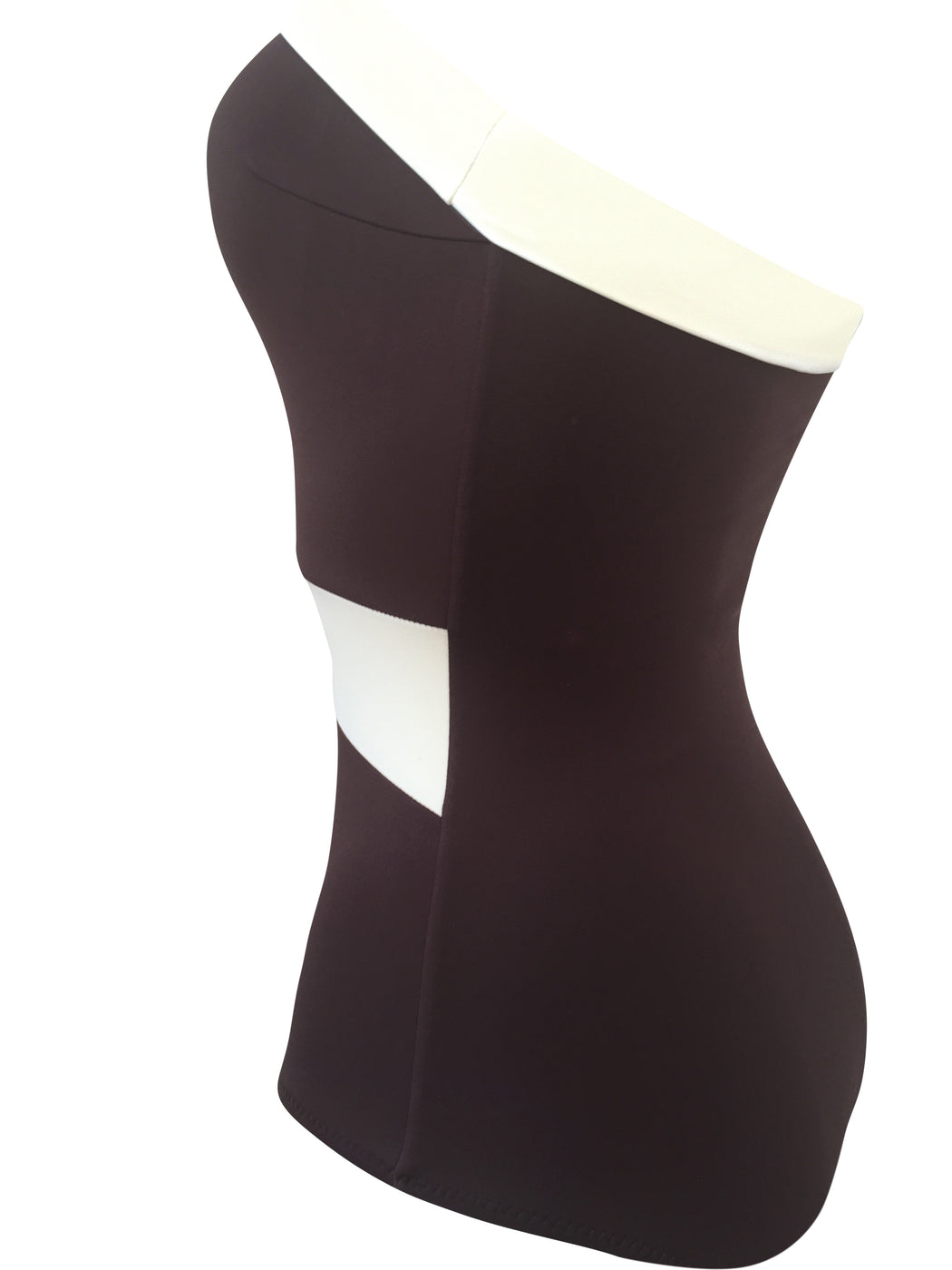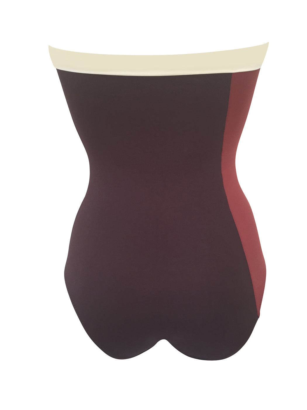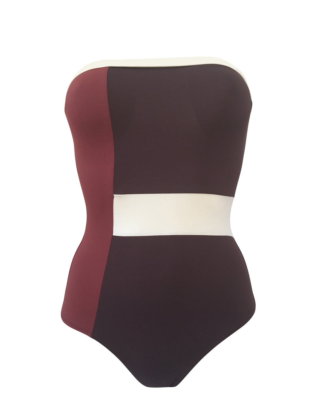 Stylish bandau one-piece swimsuit with supportive inbuilt cups and top inner secure band. High back. Firm fit.