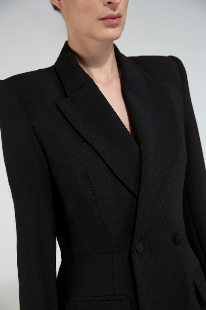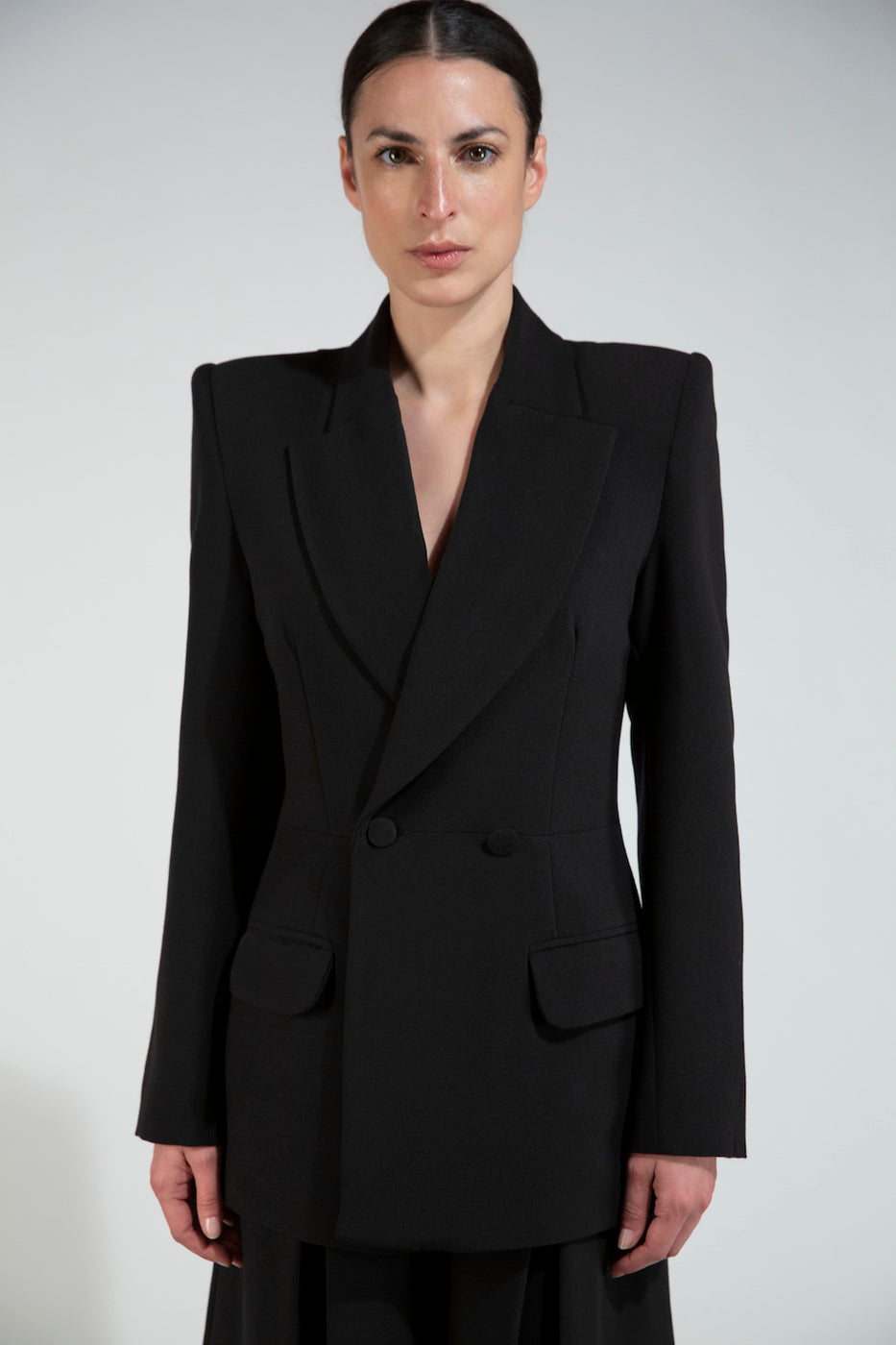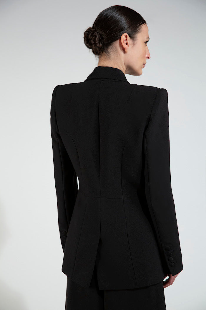 A structured tailored double-breasted jacket masterfully cut for a flattering silhouette. We love the exaggerated sharp shoulders.