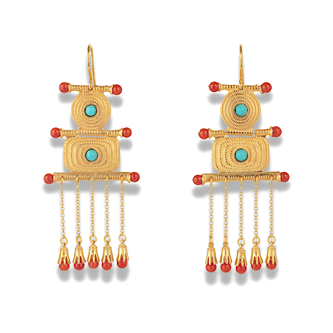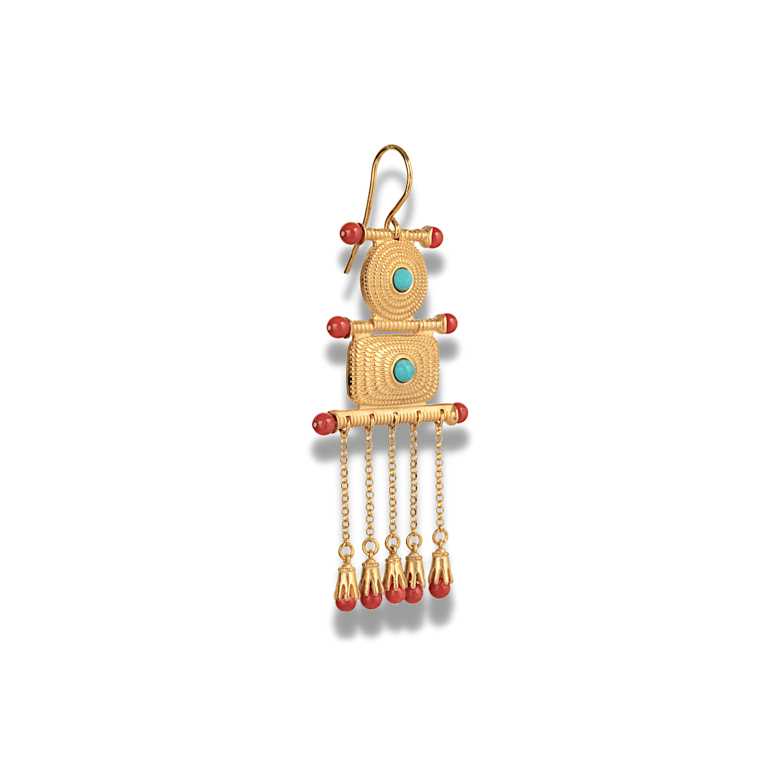 Three tiered cascading earrings featuring turquoise studded shields with 5 swinging chains completed with clawed coral micro cabuchons. This style was mostly worn in the 18th century by aristocratic women from the Epirus and Macedonian regions.