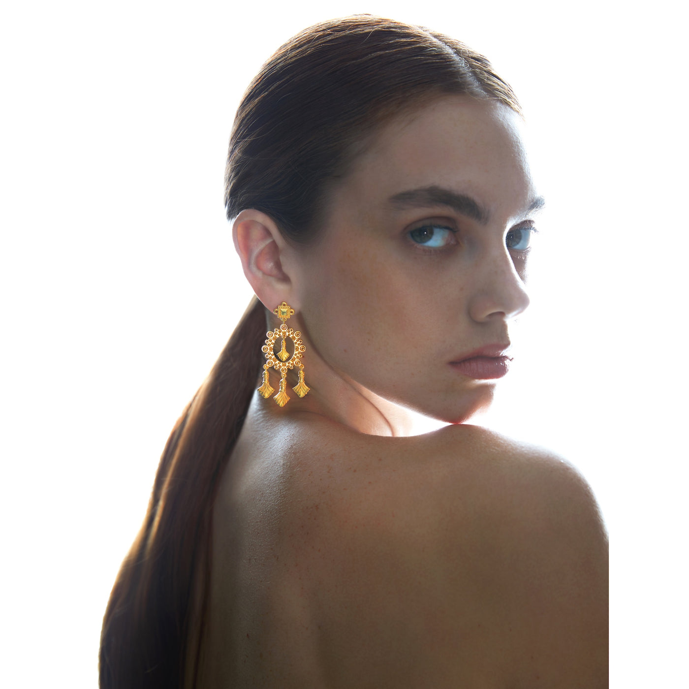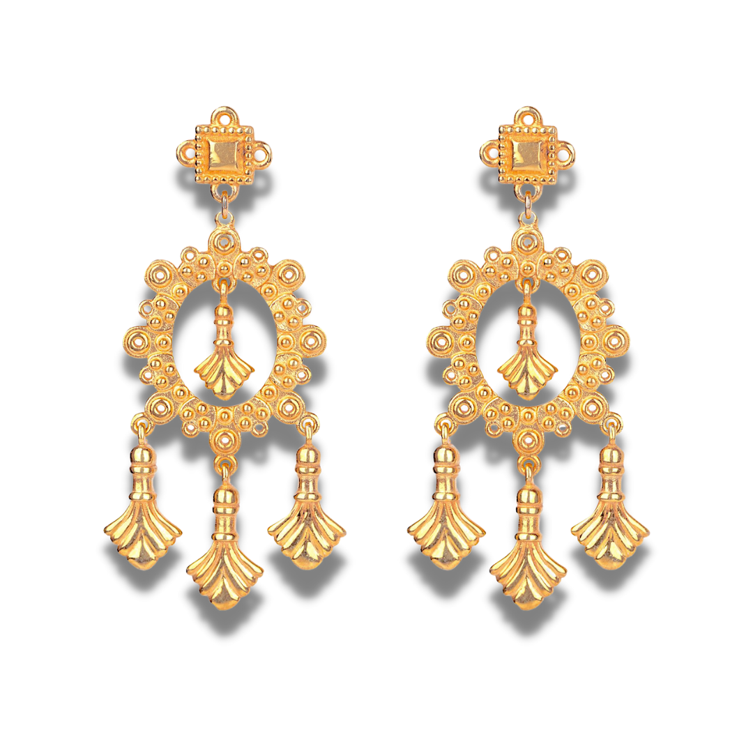 A multi-layered tiered earrings inspired by the design of a traditional Cretan necklace. Swinging pendants featuring clams and embellished with designs seen on tapestries from the island of Kasos in the Dodecanese islands.