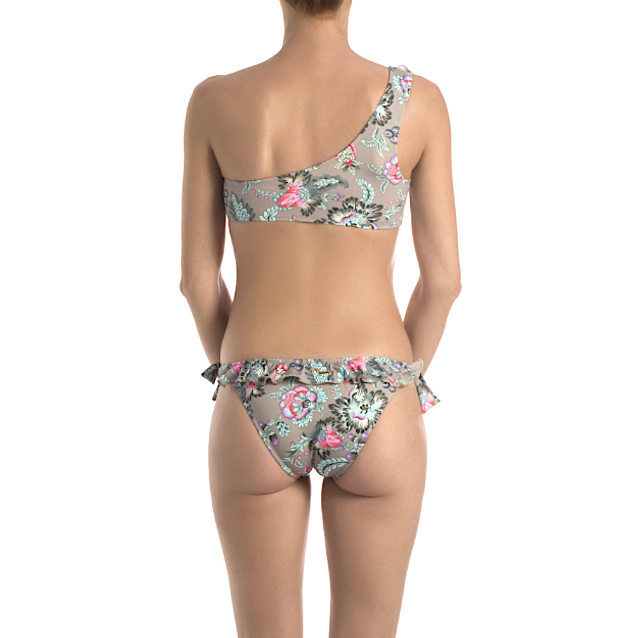 One-shoulder bikini with unique frill detailing. Low-rise bottoms are clasped with subtle tie up design.