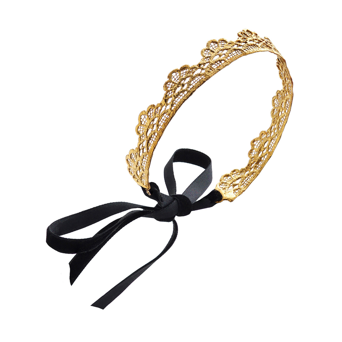 Handcrafted luxurious hammered gold lace crown headband with scalloped floral fan effect.
