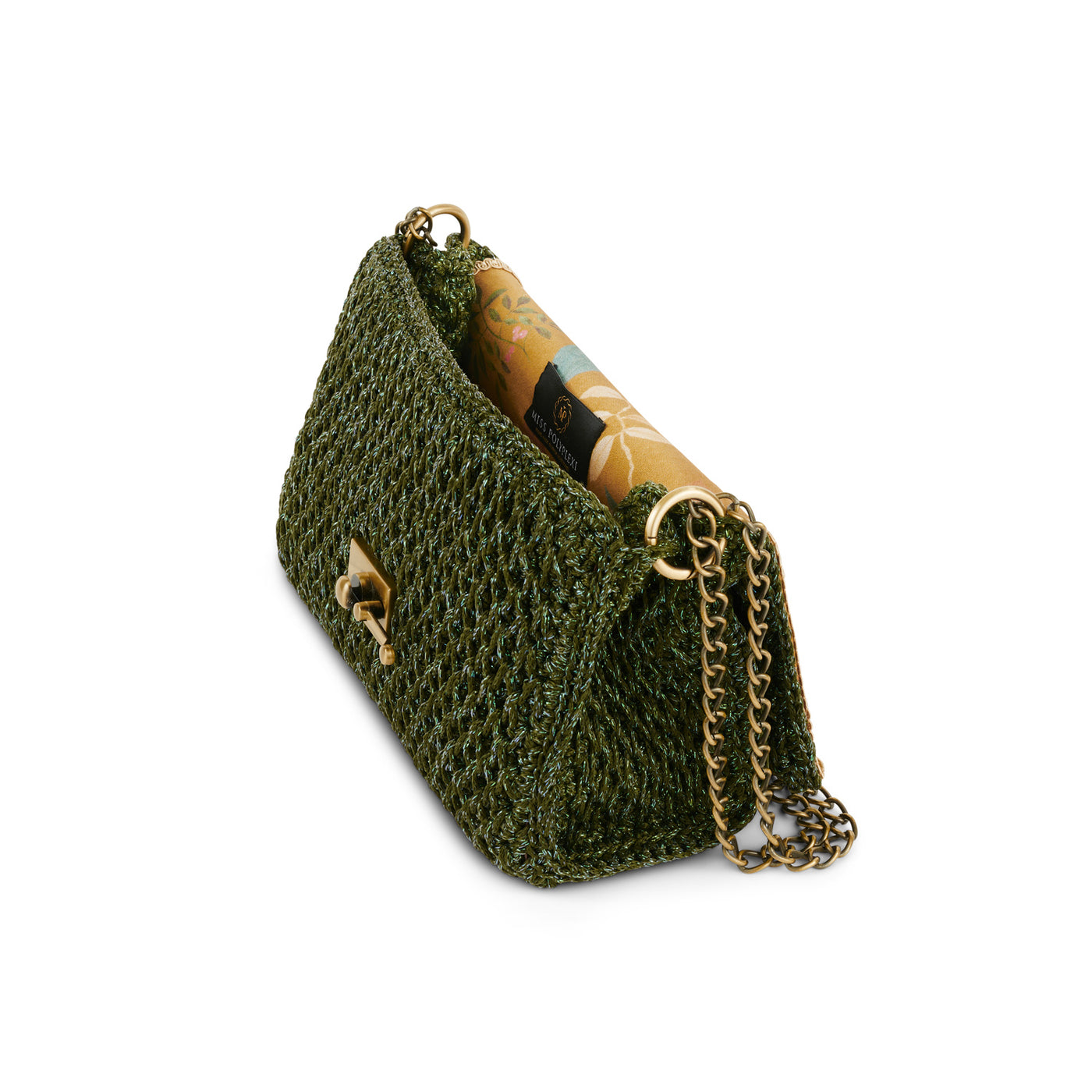 A classic evening bag with a unique crochet pattern design.