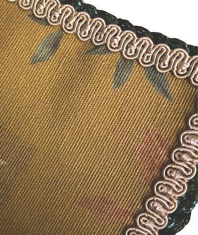 - Grograin lining throughout featuring a floral vintage print secured and framed with polished satin trimming