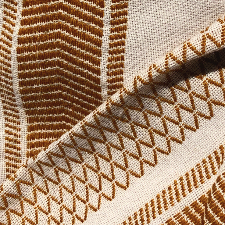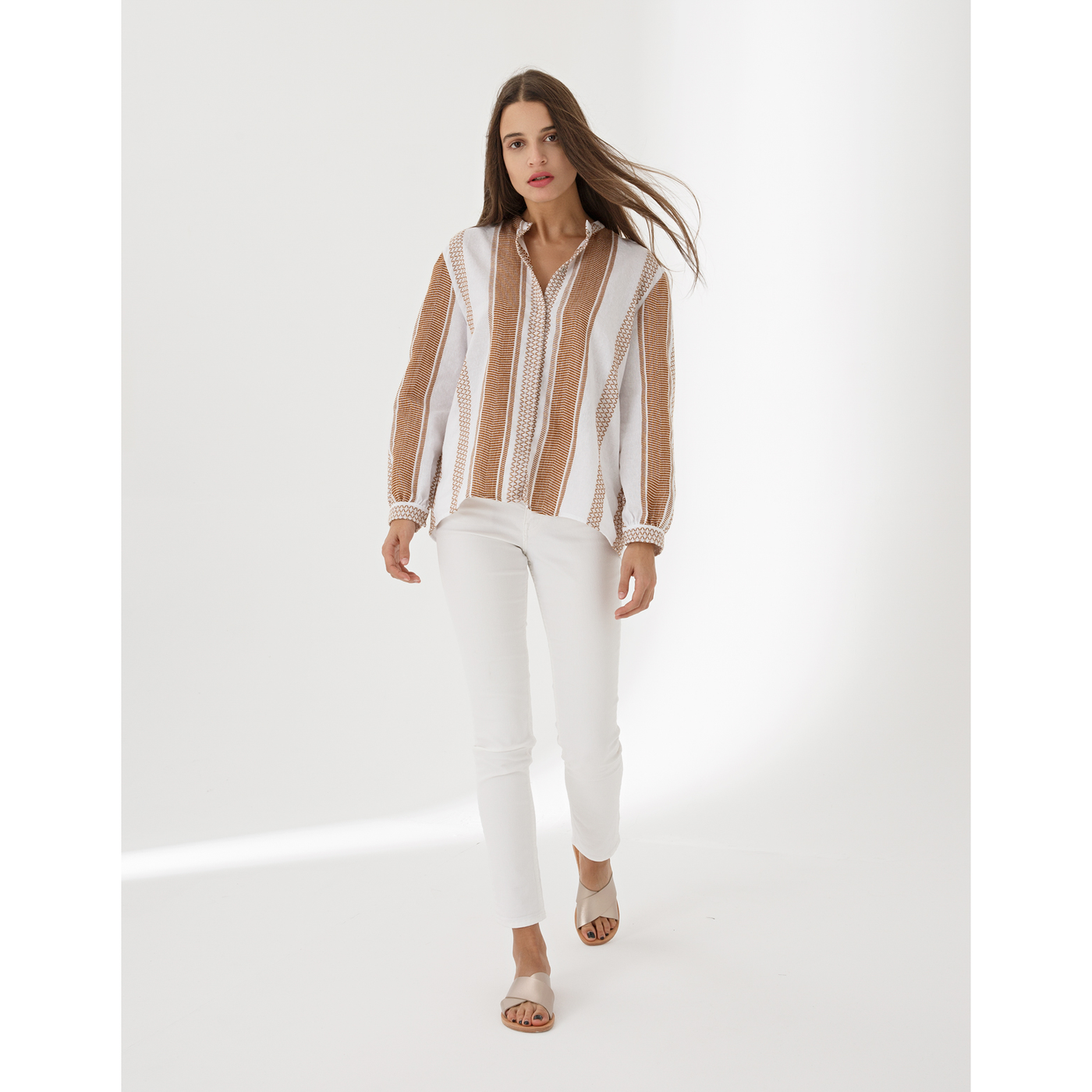 Stylish geometric pattern long sleeve blouse, featuring unique vertical woven patterns throughout.