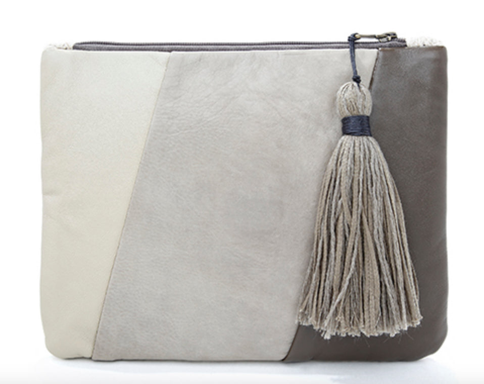 This hand woven clutch featured a textured finish and the finest leather on the reverse, and adorned with a luxurious large grey tassle.