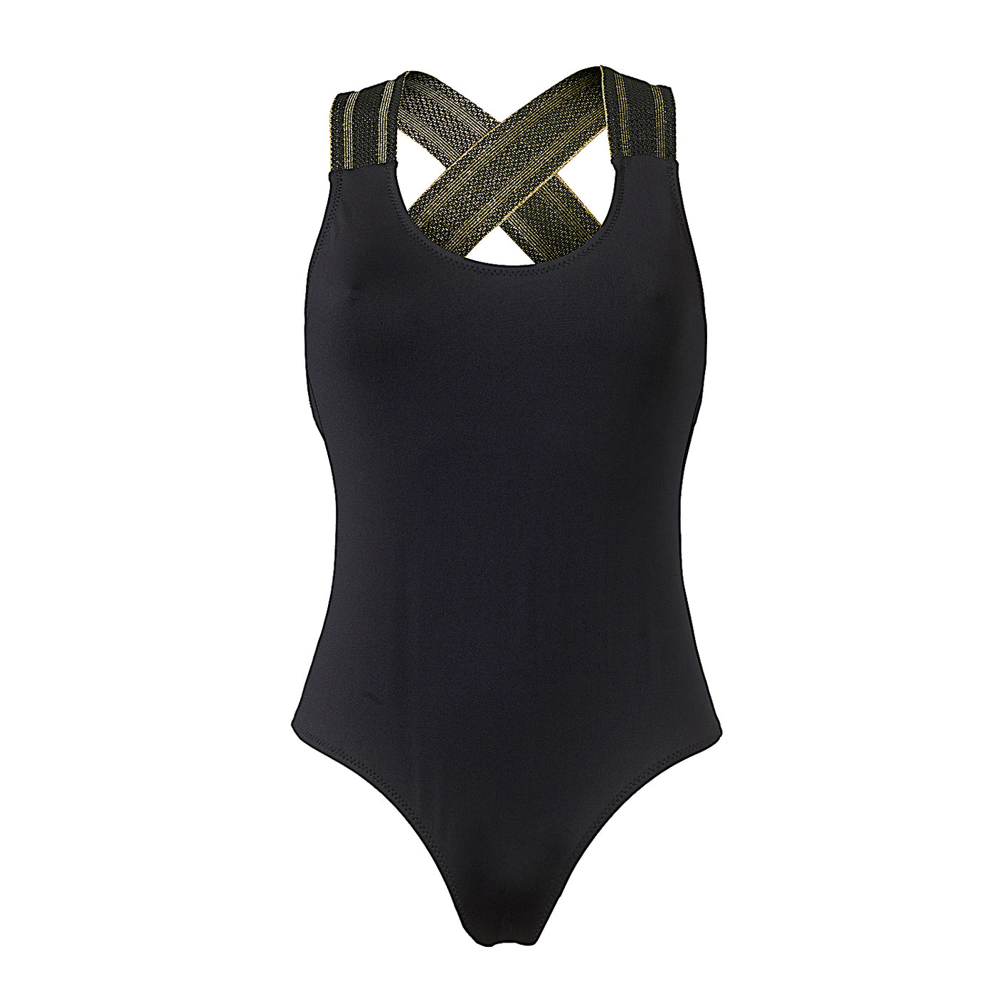 High scoop neckline one piece with comfortable wide thick high-quality, elasticised textured straps that criss-cross high across the back. Open back. Excellent support.
