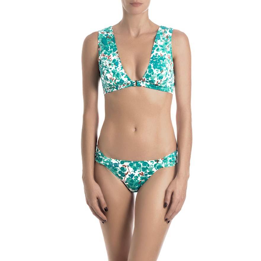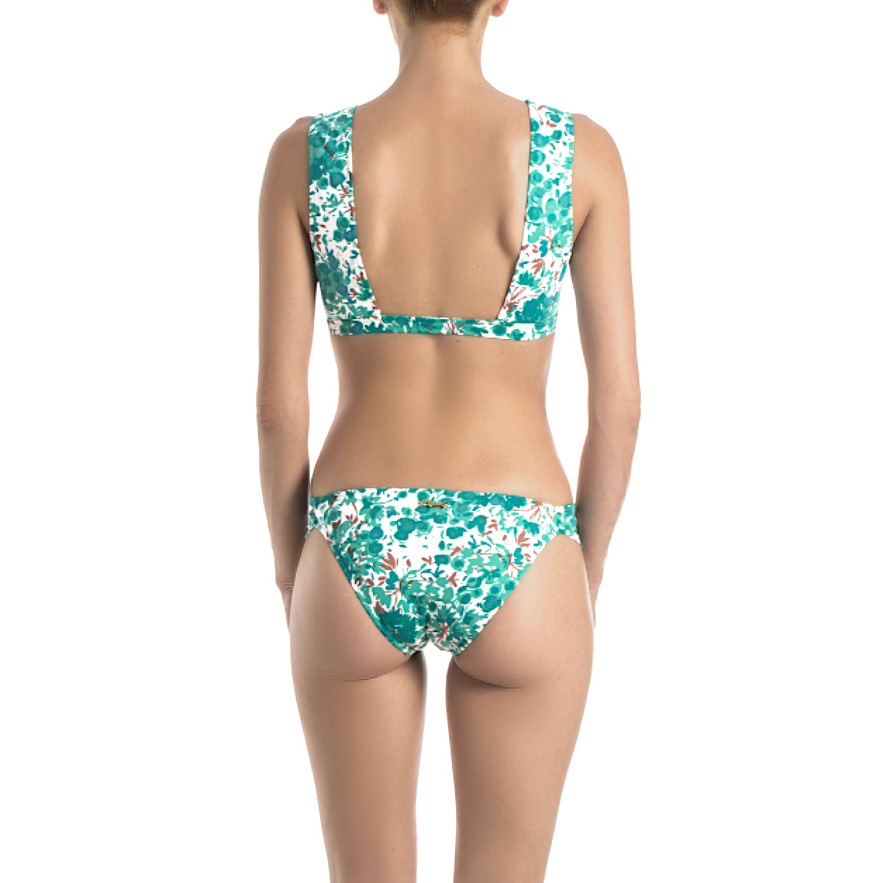 Deep V-neck bikini with wide shoulder straps for good support with low-rise bottom. Front closure with quality metallic secure hook.